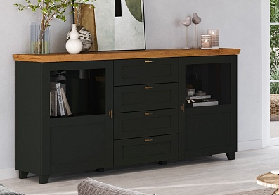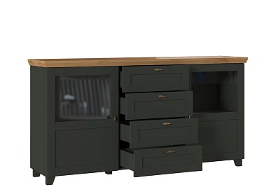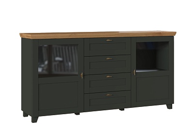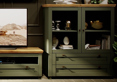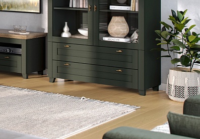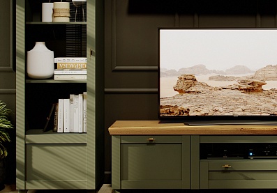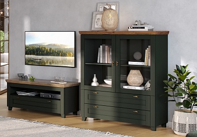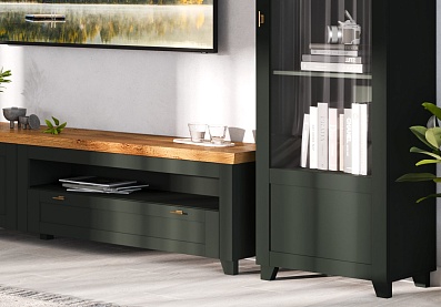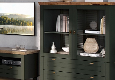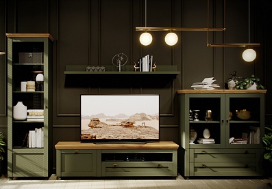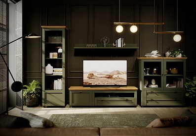 Модульная коллекция мебели Эмили, представленная возможностью создания разнообразных композиционных решений, выполнена в цвете Олива (корпус, фасады) и Таксония (крышка).
