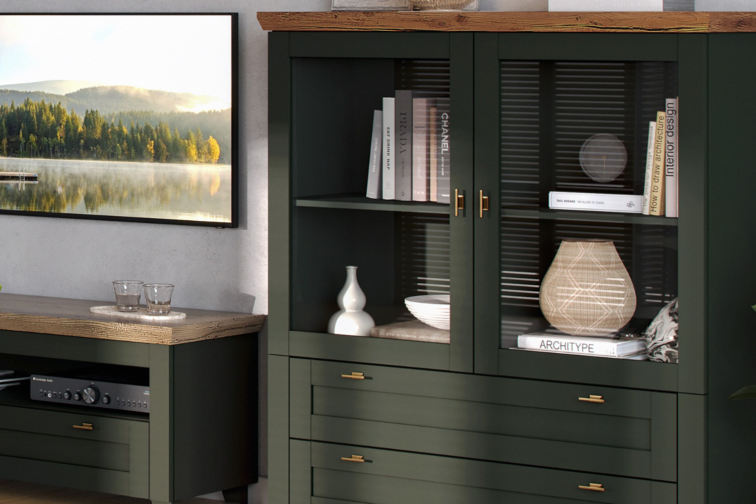 - Шкаф низкий с рамочными фасадами и двумя выдвижными ящиками;