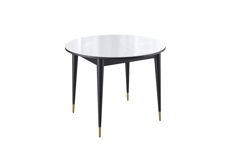 Стол обеденный Мане круглый раздвижной К1000 опоры черные с металлическими наконечниками, столешница - стекло белое глянец.