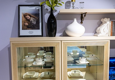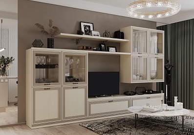 Модульная система позволит регулярно менять внешний вид гостиной по своему усмотрению. В комплект входит два навесных шкафа-витрины, напольные шкафы с застекленными вставками и глухими нижними фасадами, настенные полки и вместительная ТВ-тумба.