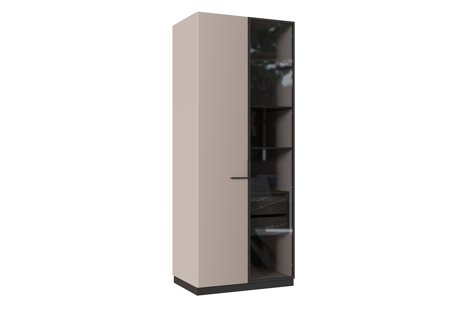 - За глухим фасадом установлена штанга для одежды и полка ЛДСП, за стеклянным – 3 полки ЛДСП;