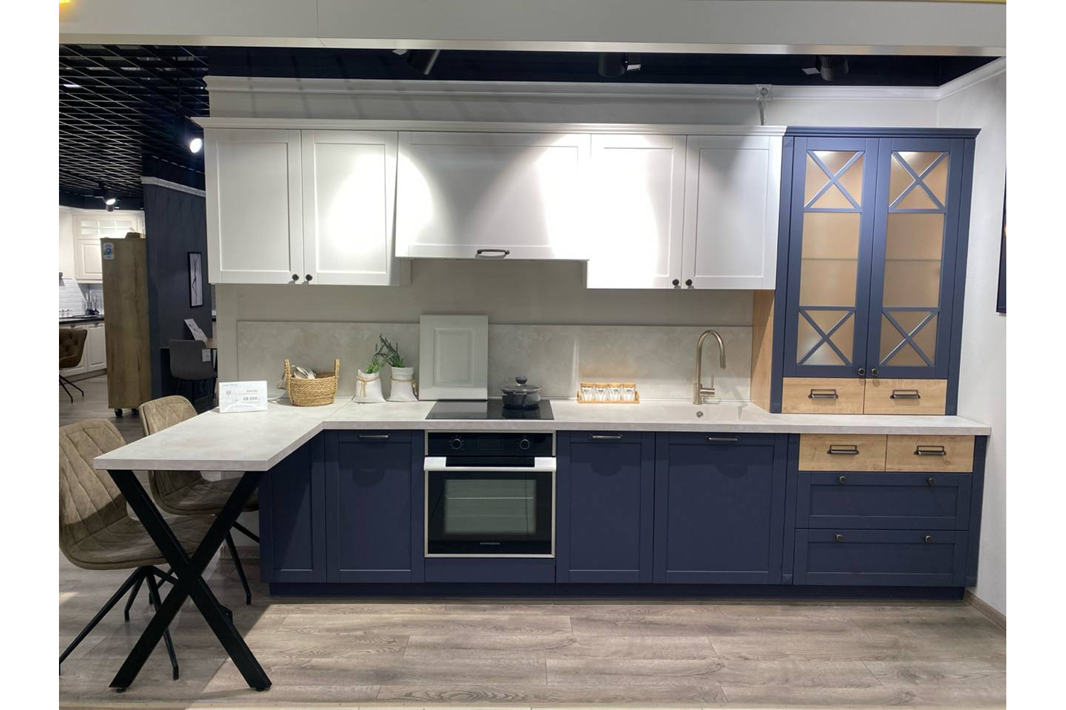 Размеры: ширина 3600 мм, высота 2213 мм Фасад МДФ 19 мм лам. 1 ст. белый, фрезеровка Кантри, в пленке ПВХ, Столешница 600 T40 Touch Line, Мойка Лигстоун 400, Стеновая панель Touch Line 600, Мусорное ведро PATTY, Организация для столовых приборов в базу 400 InnoTech, фурнитура Хетих